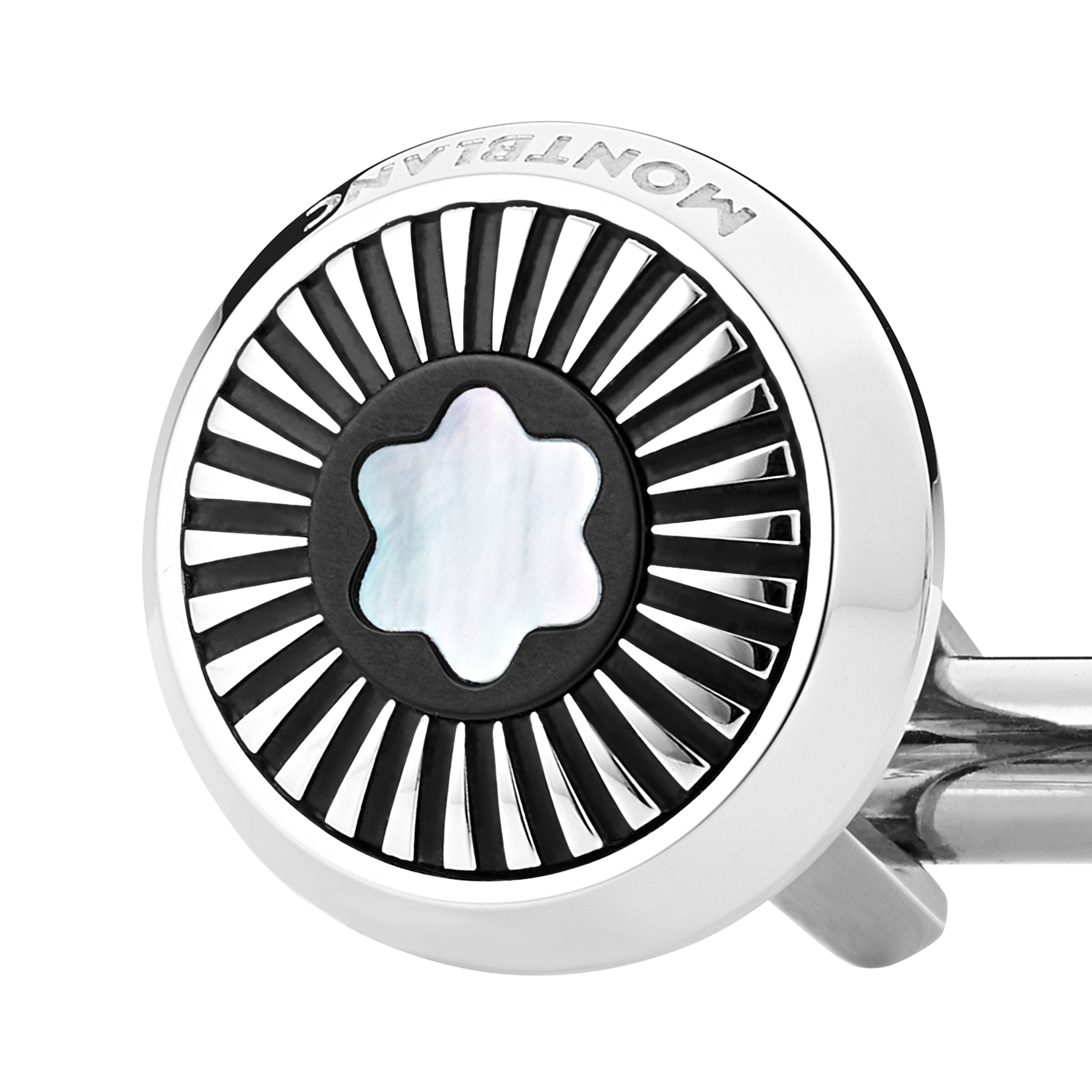 De runde Montblanc Star-mansjettknappene i rustfritt stål har et elegant strålemønster og et snøtopp-emblem i perlemor, inspirert av Montblancs klassiske designkoder. Kolleksjonen fremhever merkets emblem i ulike tolkninger og uttrykk.