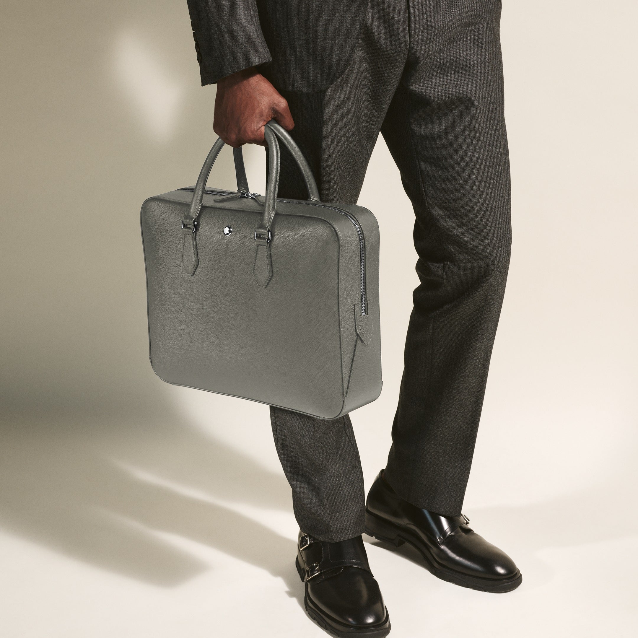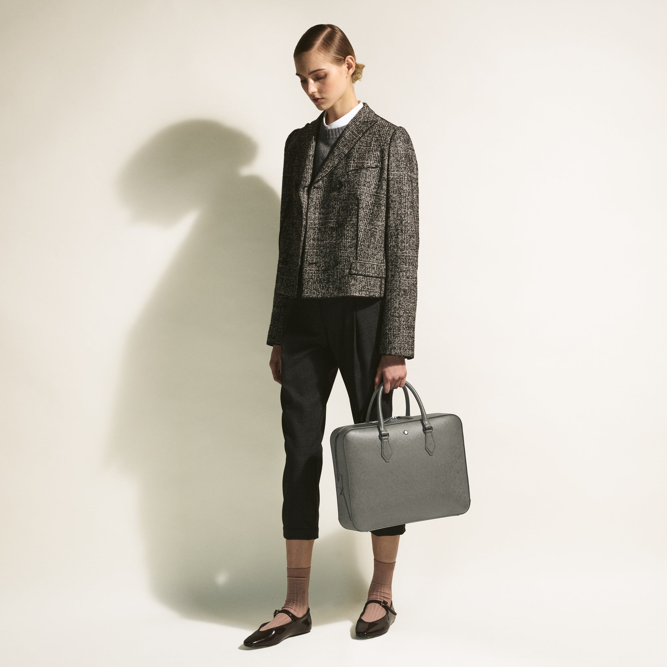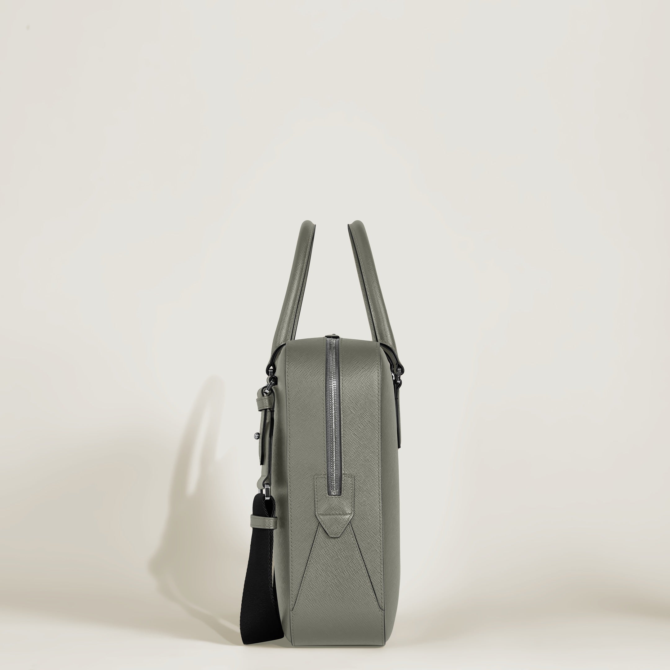 Elegant og funksjonell dokumentveske fra Sartorial-kolleksjonen, laget av Saffiano-preget fullnarvet kuskinn i mellomgrå nyanse. Vesken har et romslig hovedrom med plass til A4-dokumenter, elektroniske enheter og andre nødvendigheter til arbeidsdagen. Innvendig finnes dedikerte lommer til skriveinstrumenter, og det modulære designet gjør det mulig å feste vesken til andre produkter fra Sartorial-serien. Den luksuriøse teksturen og den sofistikerte fargen gir et tidløst og profesjonelt uttrykk.