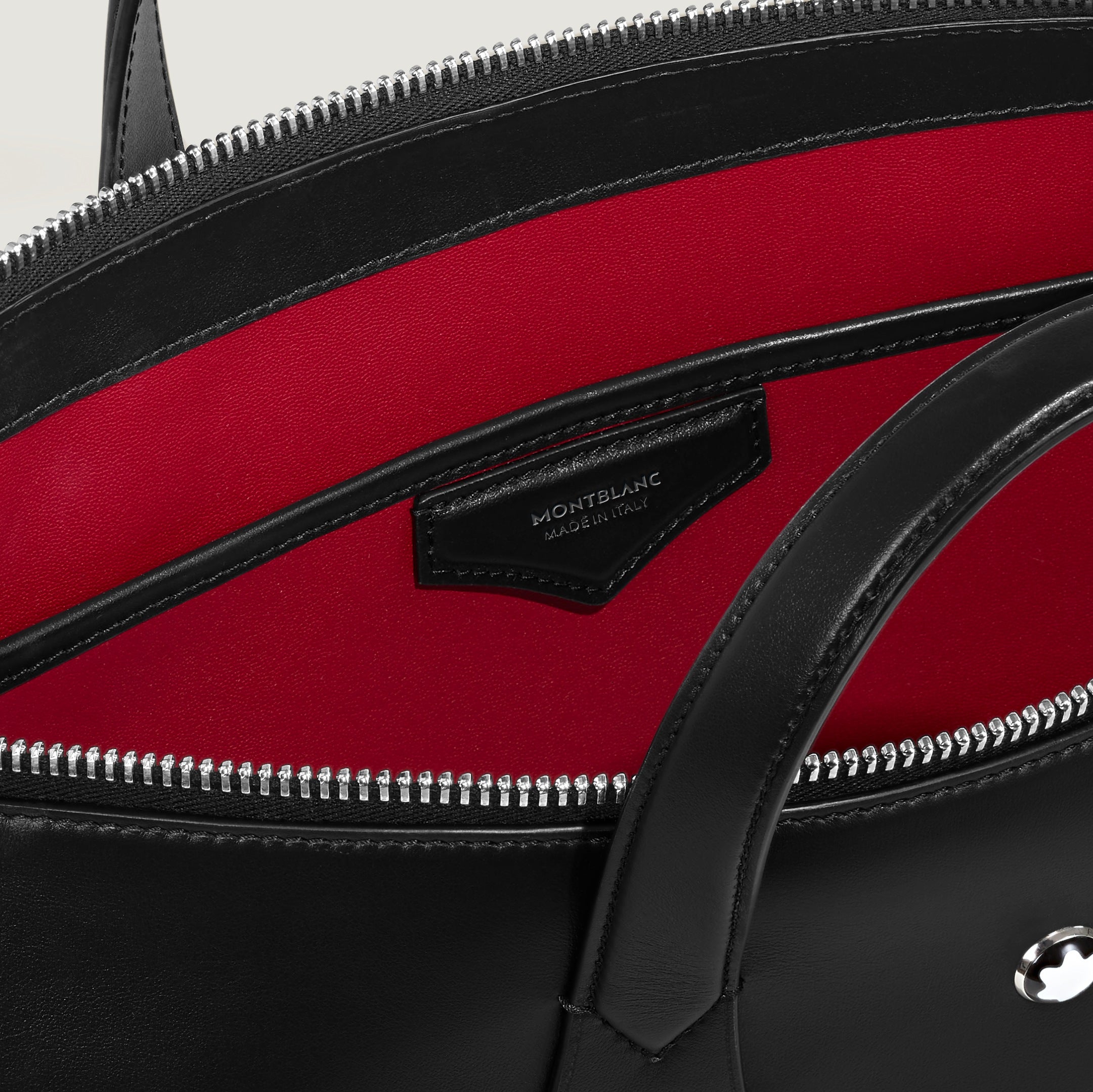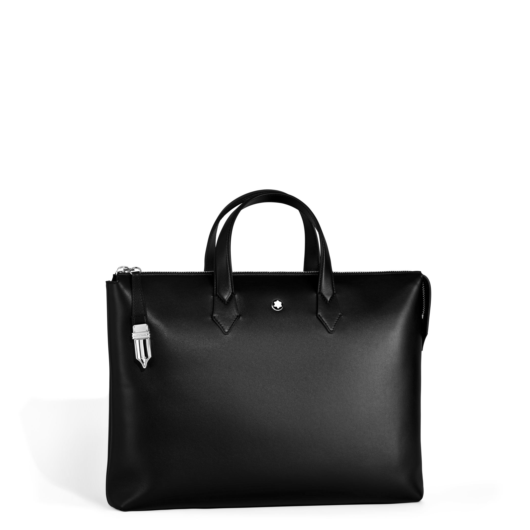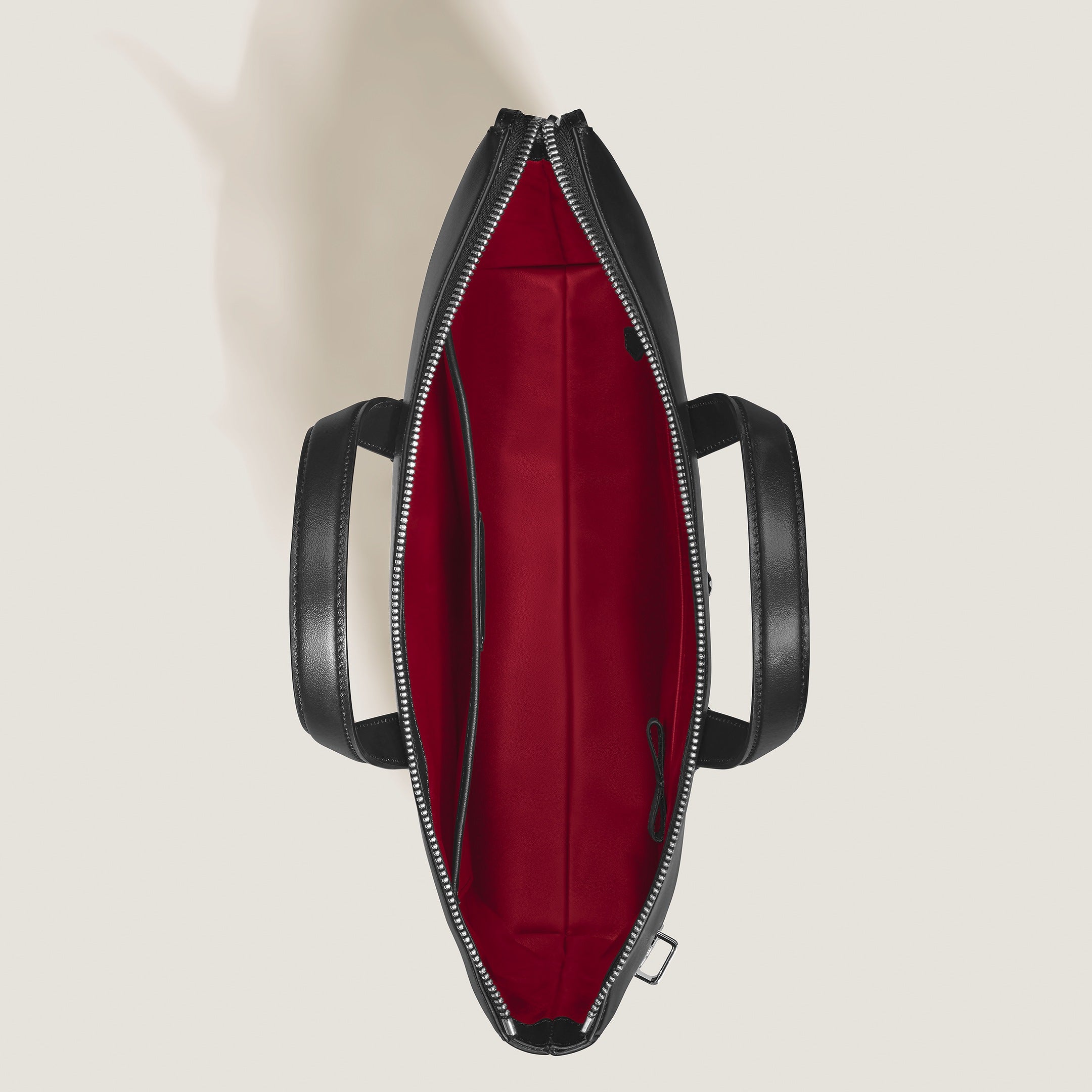 Denne elegante Soft Tote-vesken fra Montblanc kombinerer moderne funksjonalitet med ikoniske designelementer inspirert av merkets skrivearv. Laget av mykt svart skinn, har vesken en karakteristisk lukking formet som en pennesplitt – et subtilt nikk til Montblancs historie innen håndskrift og presisjon.