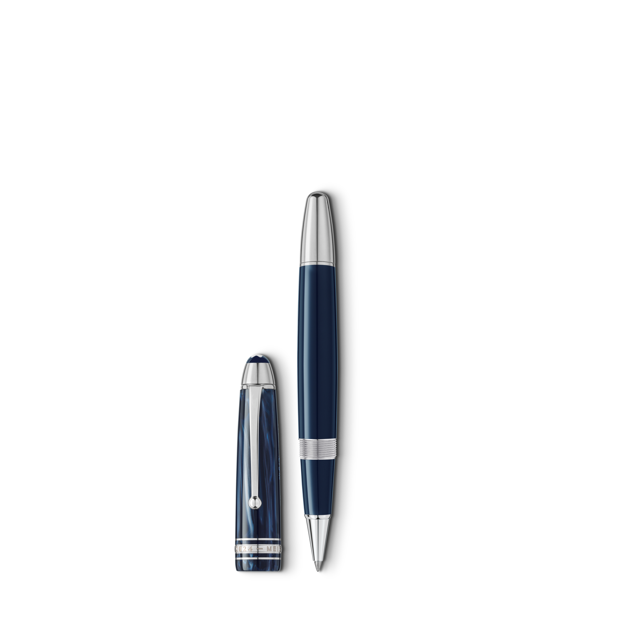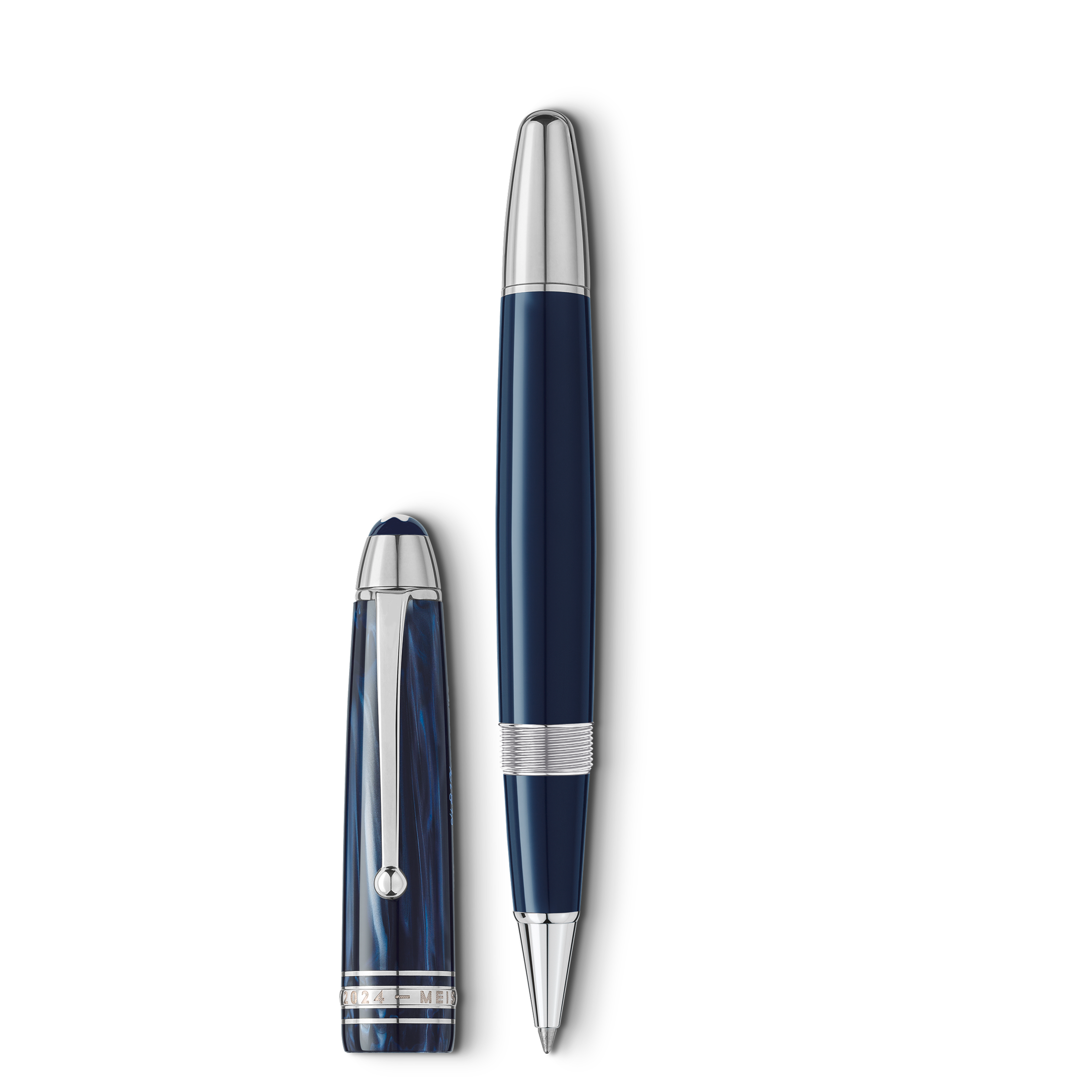 Denne jubileumsutgaven er laget i blå edelharpiks med et flytende mønster inspirert av blekkets bevegelse på papir. Hatten prydes av et lasergravert, vintage Meisterstück-logo og spesialdesignet jubileumsring med årstallene «1924» og «2024». Klipset er platinabelagt og utformet som en hyllest til de første Meisterstück-pennene.