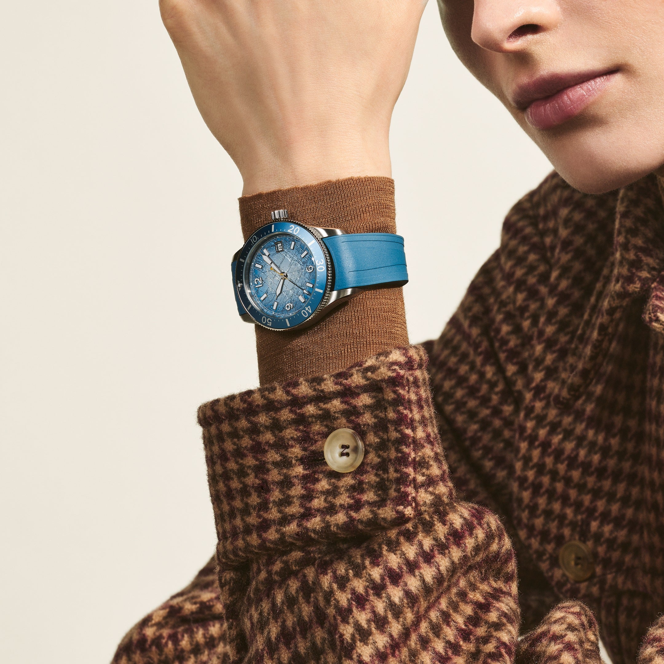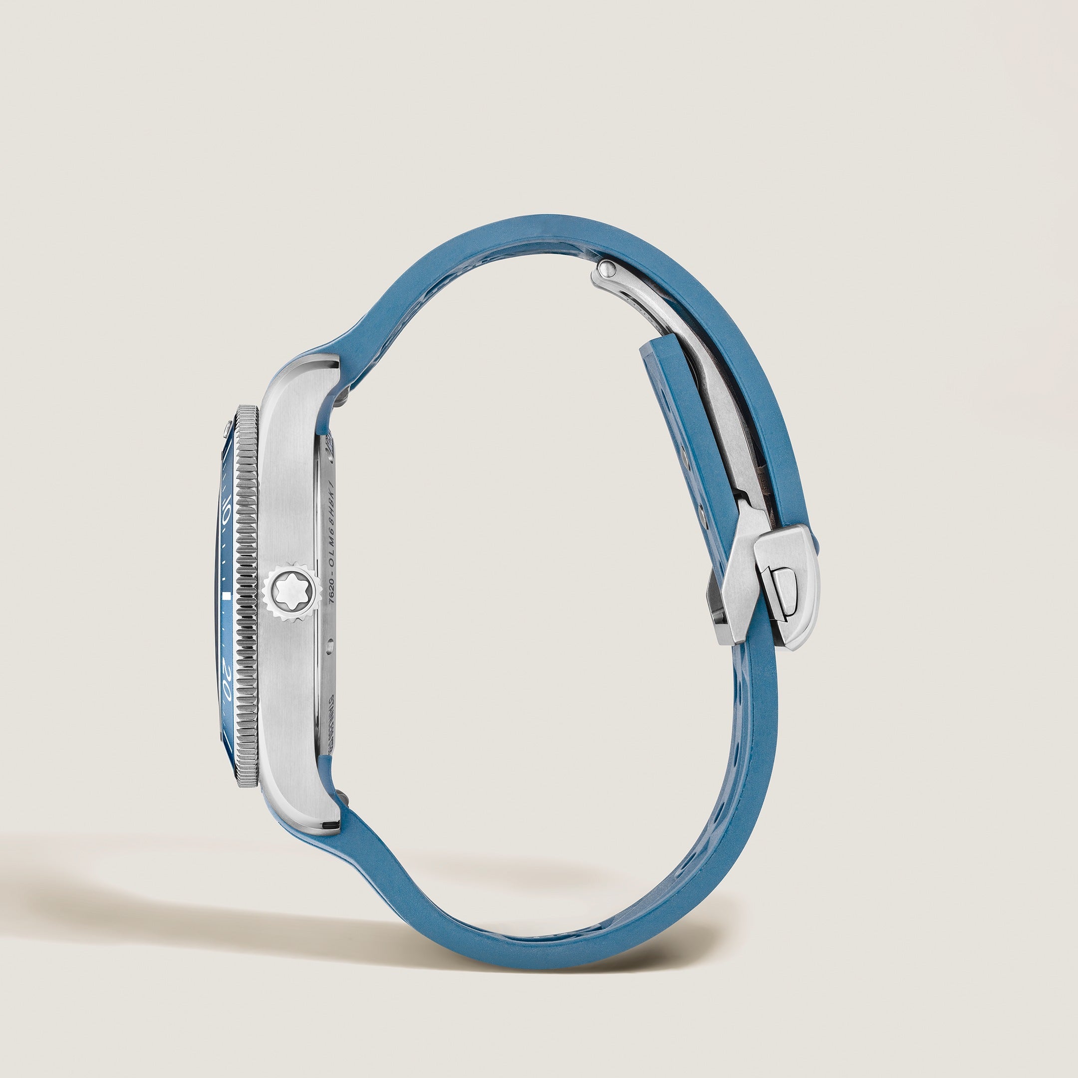 Montblanc Iced Sea Automatic Date 0 Oxygen med blå sfumato isbre-urskive er inspirert av den majestetiske Mer de Glace. Den unike teksturen er skapt ved hjelp av den tradisjonelle gratté-boisé-teknikken og gir følelsen av å se inn i isens dype lag. Urkassen på 38 mm i rustfritt stål er helt fri for oksygen, noe som forhindrer kondens og øker presisjonen og holdbarheten.