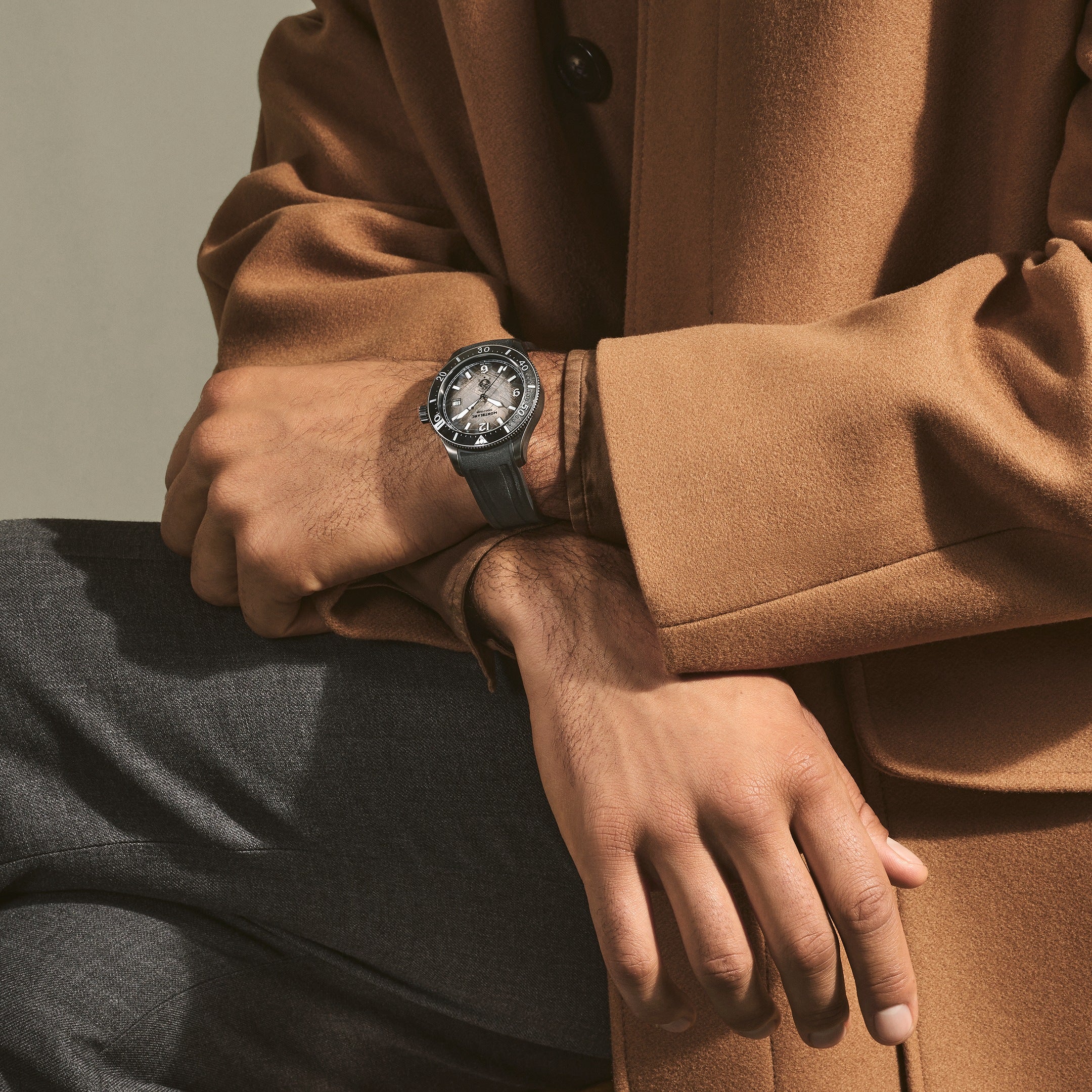 Urkassen på 41 mm er laget i børstet stål uten oksygen for å forhindre kondens og sikre optimal presisjon. Den har en énveis roterende bezel i svart keramikk, lasergravert fra 0–15 minutter, samt en 3D-gravert bakside som viser et imponerende isbrevindu. Den utskiftbare gummiremmen i svart har justerbart system for perfekt passform.