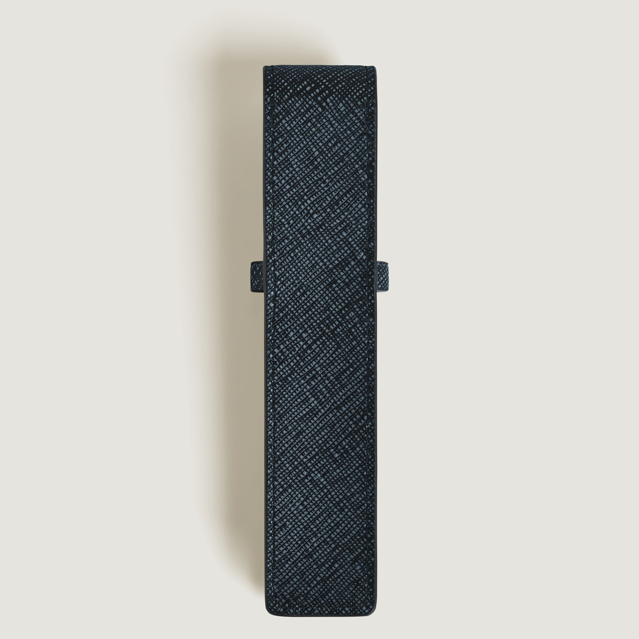 Elegant pennveske laget av preget Sartorial-skinn i en sofistikert tofarget kombinasjon av blått og svart. Det overlappende designet er inspirert av formen på en konvolutt – en subtil referanse til skrivekunstens tradisjon. Vesken beskytter én penn og er et stilig tilbehør for både arbeid og reise.