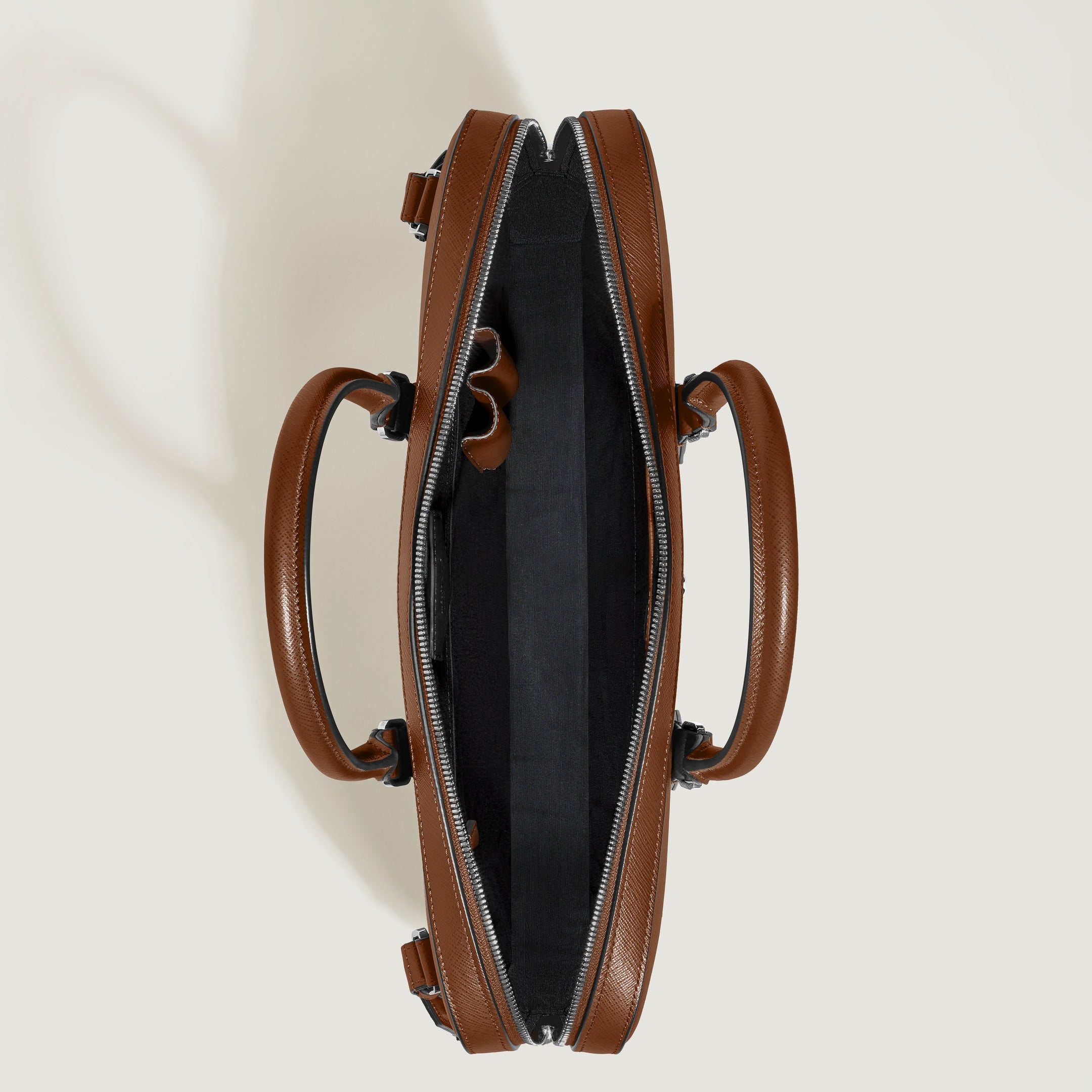 Denne slanke dokumentvesken kombinerer Montblancs skrivearv med moderne funksjonalitet. Laget av preget Sartorial-skinn i en elegant fauve-farge, er den skreddersydd for profesjonelle behov. Det romslige hovedrommet gir god plass til A4-dokumenter, elektroniske enheter og skriveutstyr, mens den avtakbare og justerbare skulderstroppen gir fleksible bæremuligheter.