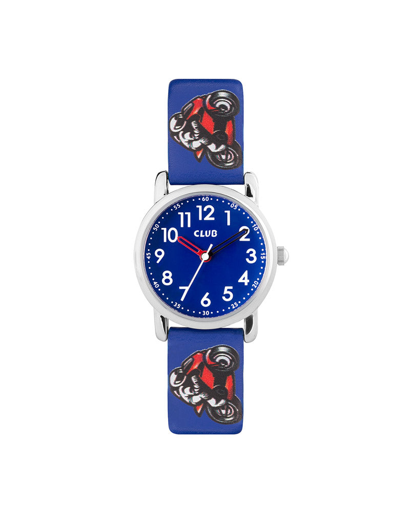 En perfekt klokke for små fartsglade eventyrere! Denne tøffe barneklokken har en blå PU-rem med motorsykkelmotiv, en stålfarget kasse på 27 mm og en klar blå urskive med store, hvite arabertall som gjør det enkelt å lære klokken.