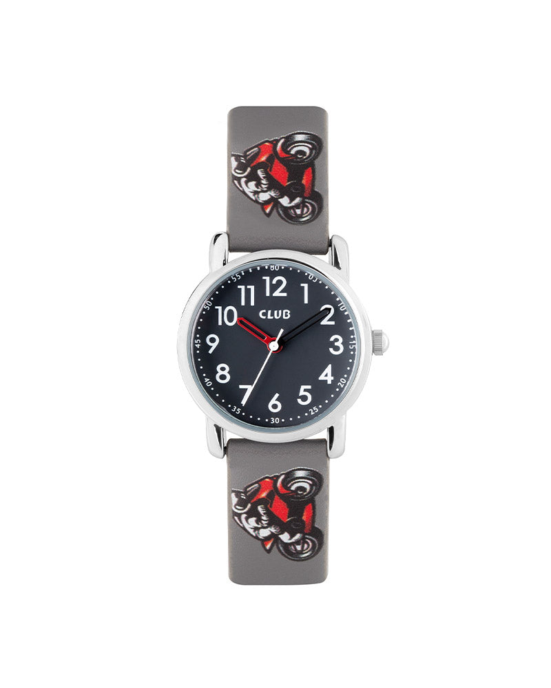 En perfekt klokke for små fartsglade eventyrere! Denne tøffe barneklokken har en grå PU-rem med motorsykkelmotiv, en stålfarget kasse på 27 mm og en matchende grå urskive med store, hvite arabertall som gjør det enkelt å lære klokken.