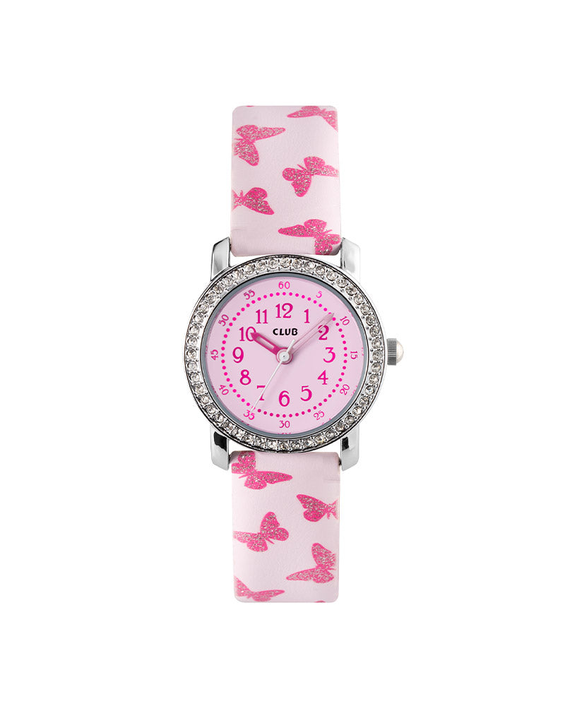 Denne nydelige barneklokken er perfekt for barn som elsker alt som glitrer. Den har en rosa PU-rem med skinnende sommerfugler, en stålfarget kasse på 27 mm med glitrende stener på rammen, og en rosa urskive med tydelige tall som gjør det lett å lese tiden.