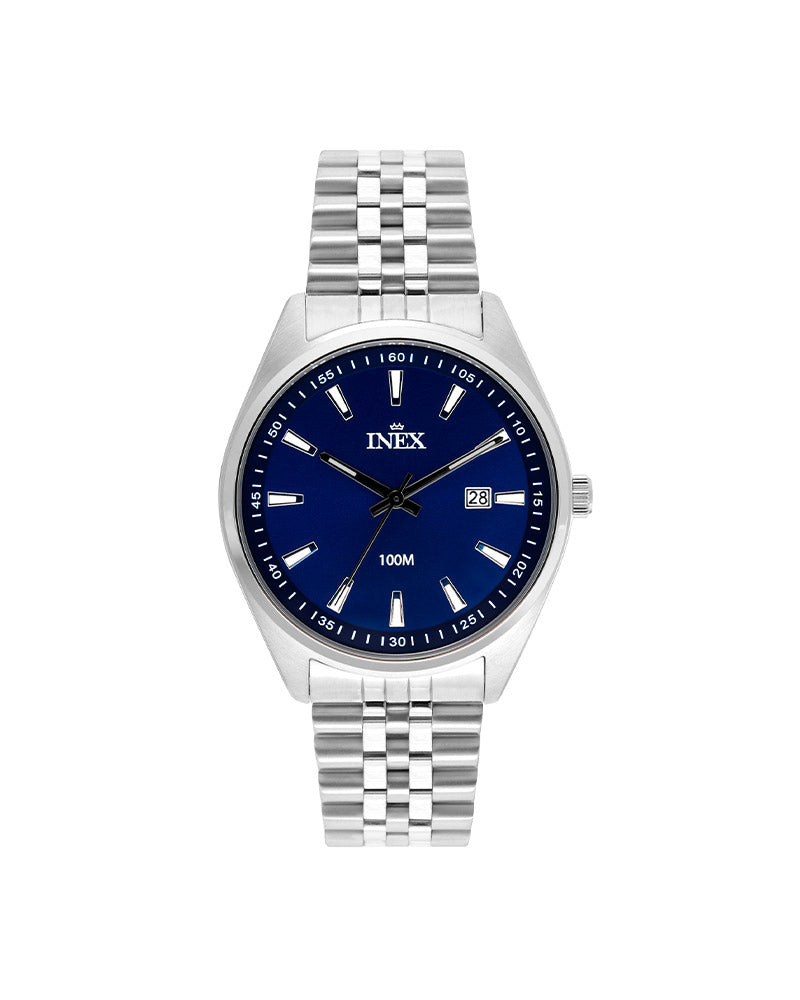 Herreklokke fra Inex med solid stålkasse og blå skive. Skiven har hvite indeksmarkeringer, sorte visere og datovisning klokken 3. Skiven beskyttes av et mineralglass, og klokken har en vanntetthet på 100 meter. Den solide lenken er laget av rustfritt stål og ligger behagelig rundt håndleddet.