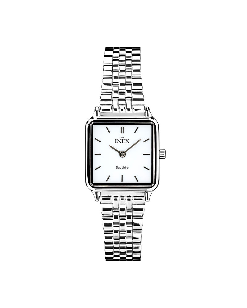 Firkantet dameklokke fra Inex med lenke og kasse i rustfritt stål. Kassen måler 23x23 mm. Skiven er hvit med sølvfargede indekser og beskyttes av et ripesikkert safirglass.
