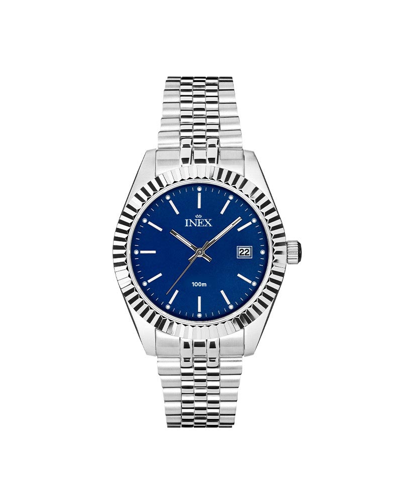 En stilren herreklokke fra Inex som måler 39,5 mm. Klokken har en sølvfarget lenke i rustfritt stål og en kasse med elegante detaljer på ringen som rammer inn skiven. Urskiven er blå med indeksmarkeringer, sølvfargede detaljer og datovisning klokken 3.