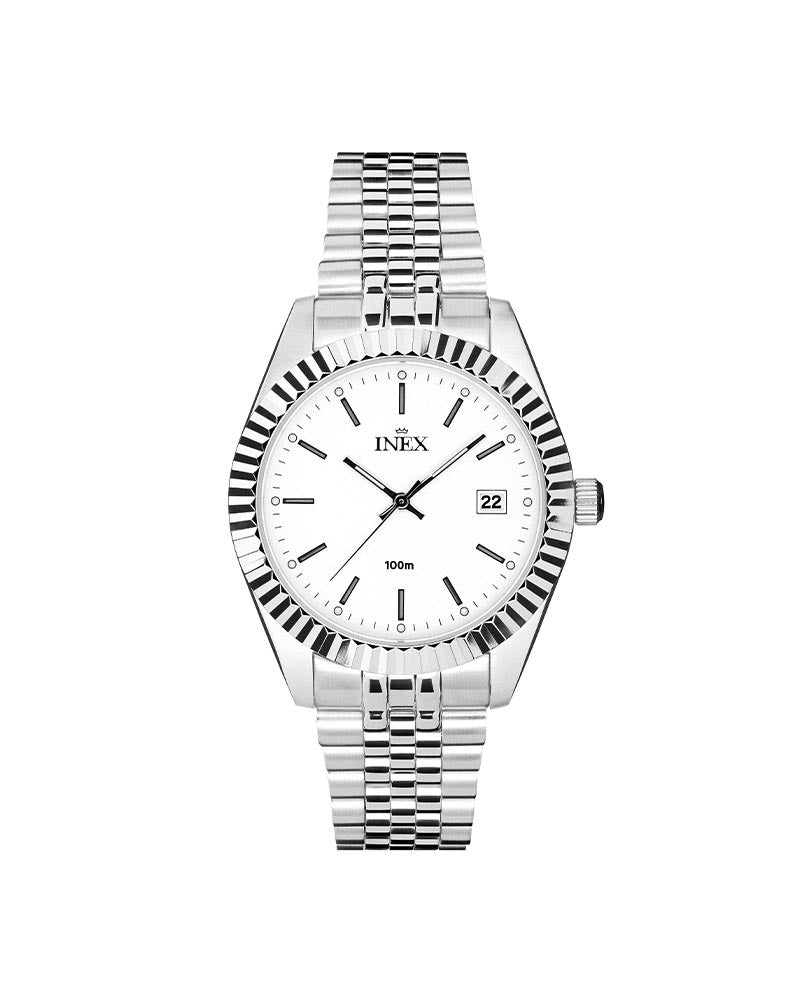 En stilren herreklokke fra Inex som måler 39,5 mm. Klokken har en sølvfarget lenke i rustfritt stål og en kasse med elegante detaljer på ringen som rammer inn skiven. Urskiven er hvit med indeksmarkeringer, sølvfargede detaljer og datovisning klokken 3.