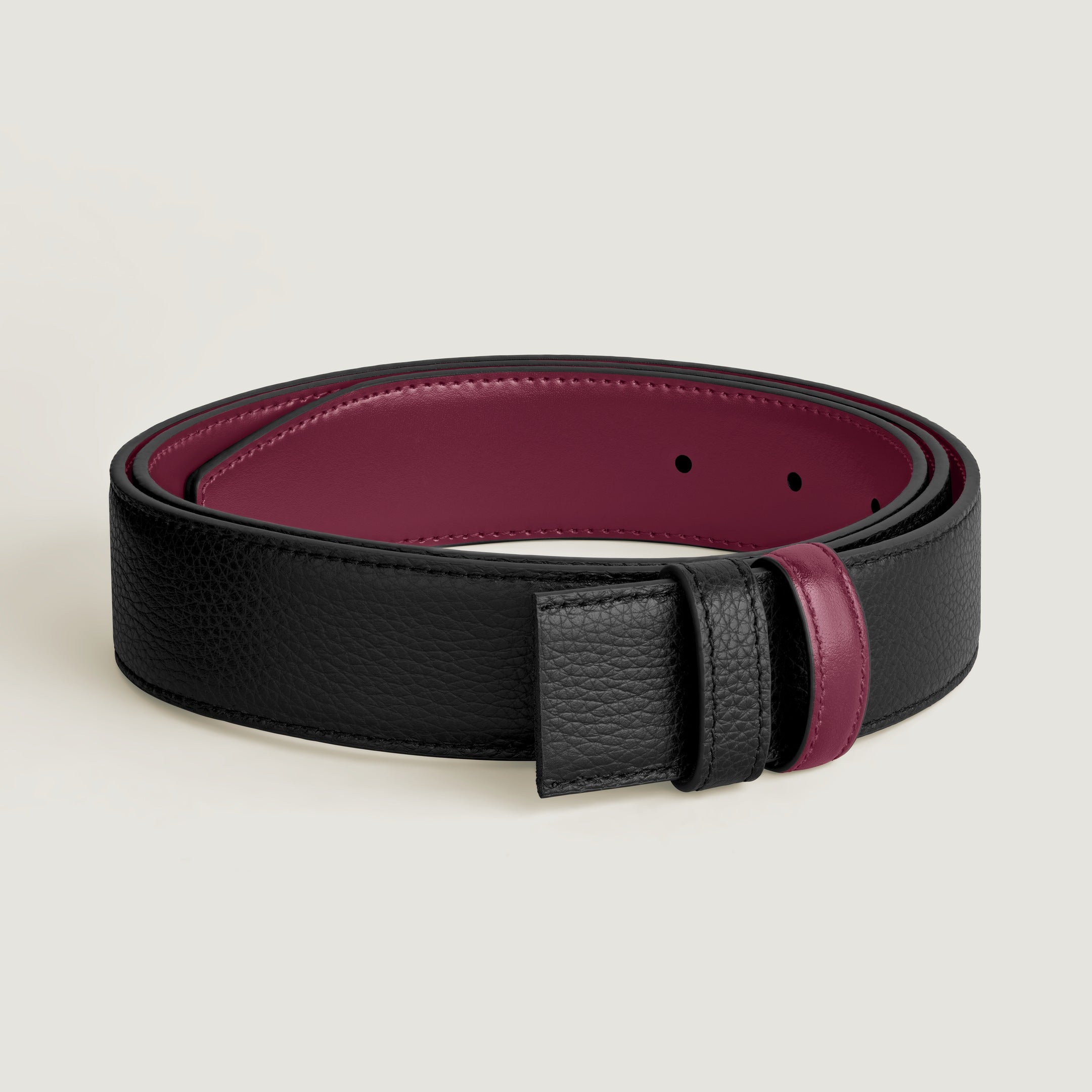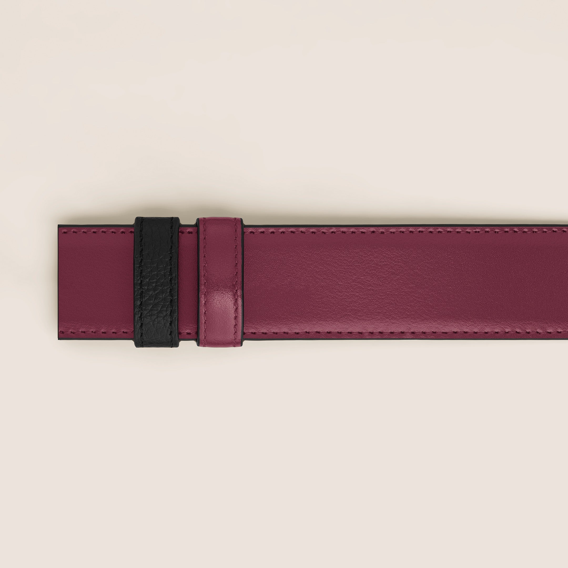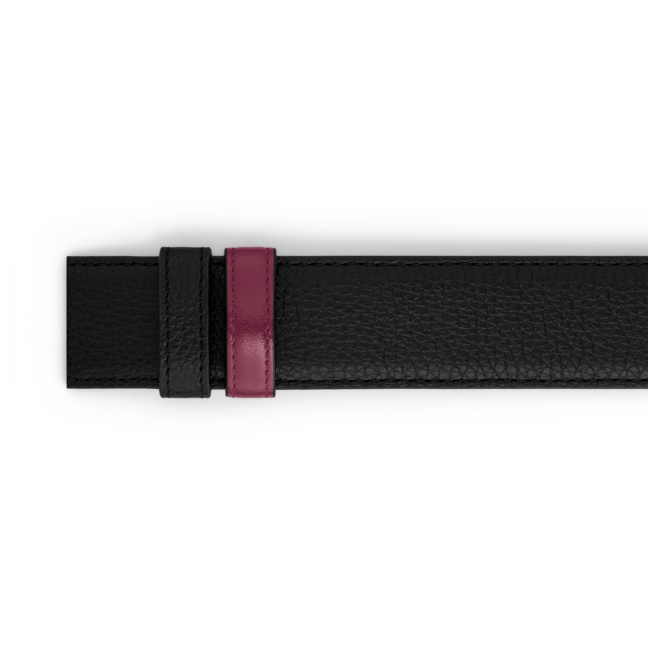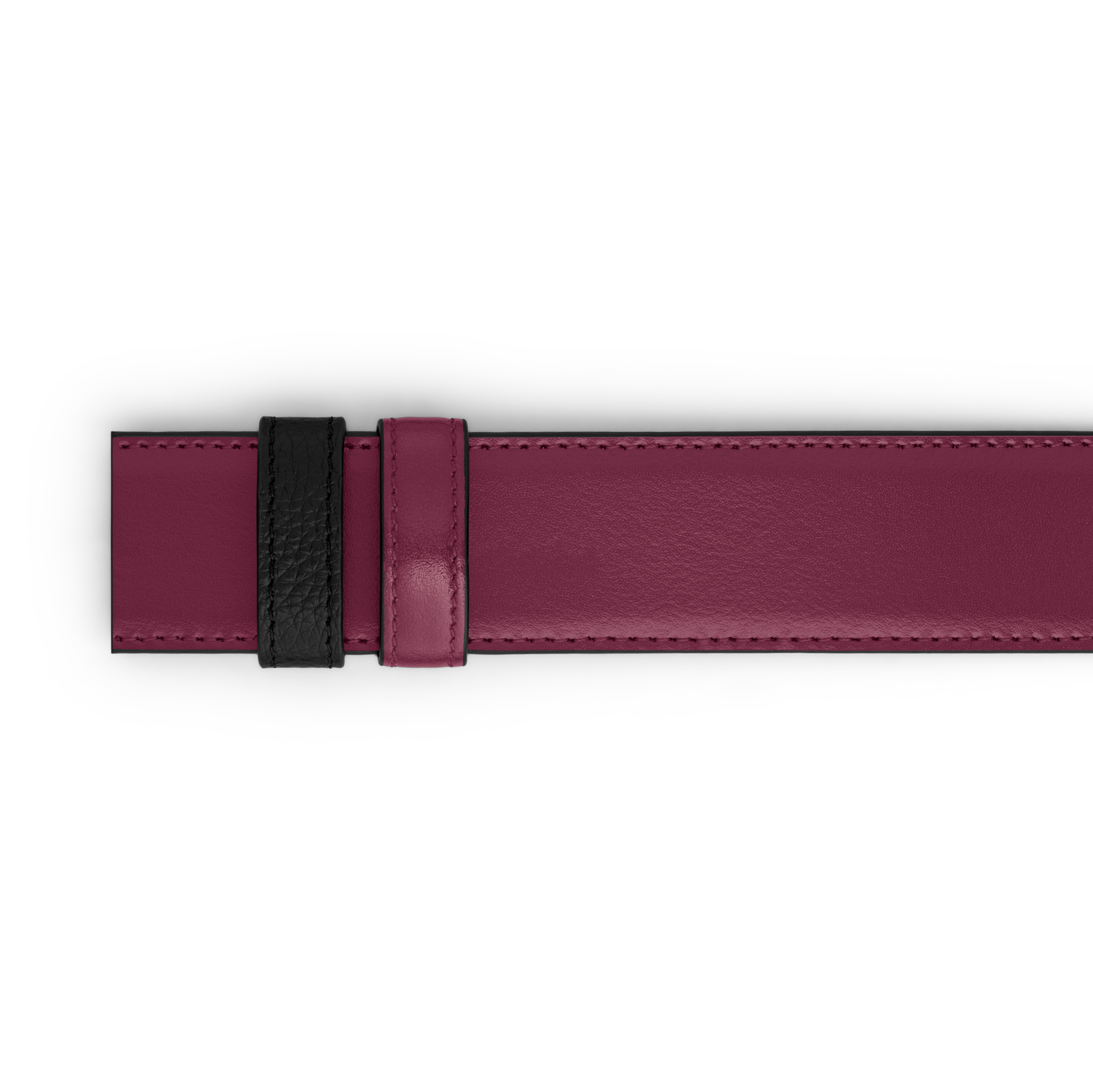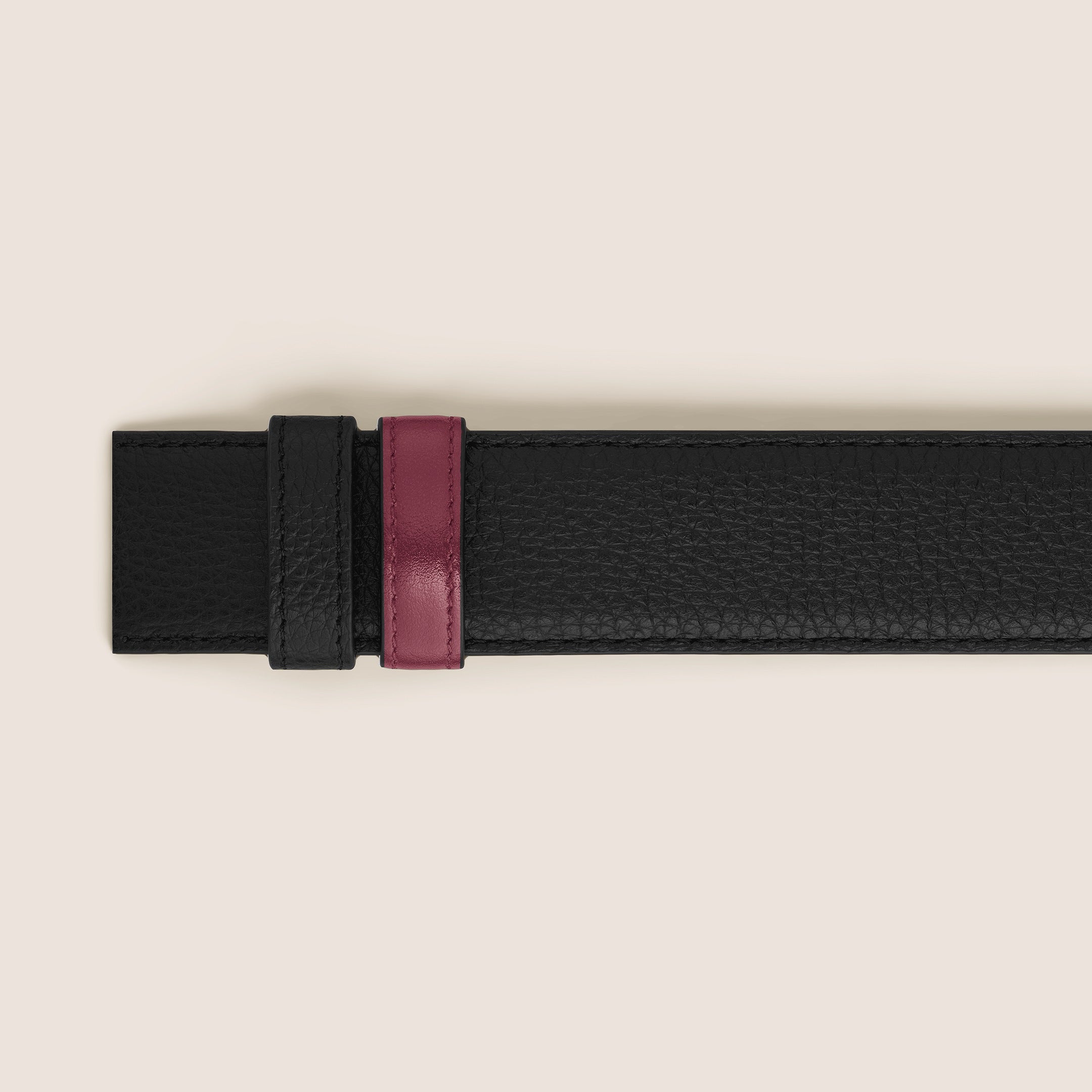 Vendbart belte fra Montblanc, laget av kornet skinn i en sofistikert kombinasjon av svart og cassis (dyp burgunderlilla). Beltet har et elegant palladiumbelagt spennefeste og kan enkelt vendes for å passe ulike stiler og anledninger.