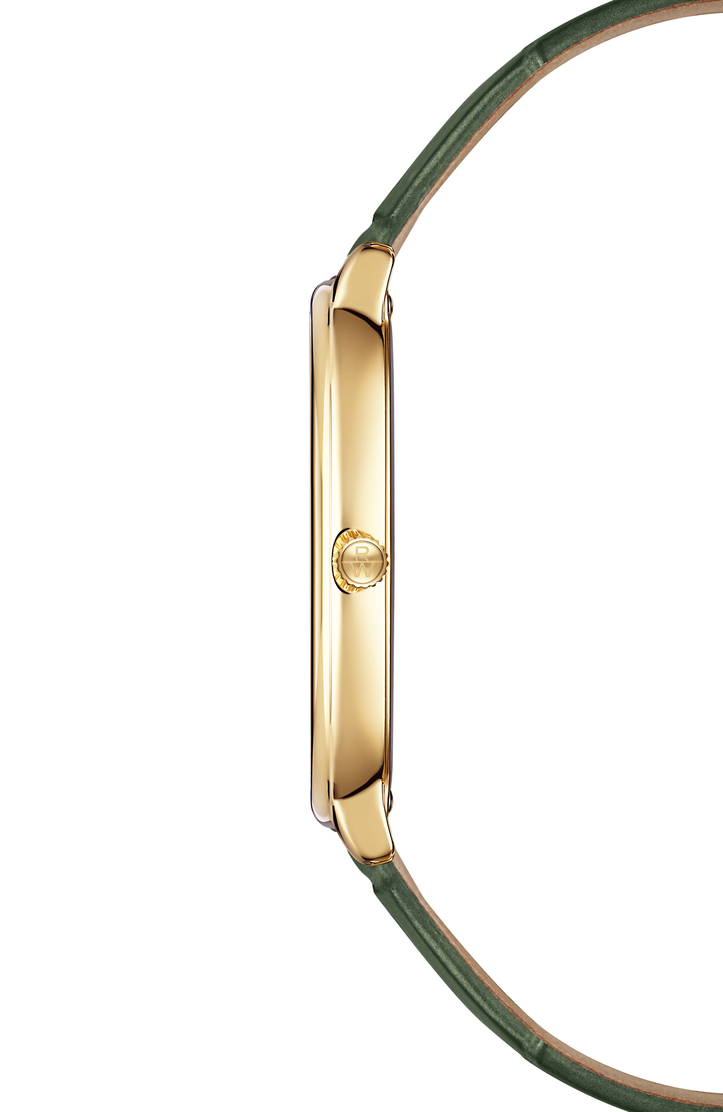 Klokken har en grønn rem i ekte kalveskinn, som gir både komfort og kontrast til den gylne kassen. Safirglasset med dobbel antirefleksbehandling beskytter urskiven, og gjennom baklokket i safirglass kan du beundre det presise sveitsiske urverket. Med vannbestandighet på opptil 30 meter (3 ATM) og et pålitelig quartzverk, passer denne Toccata-modellen like godt til hverdagsbruk som til mer formelle anledninger.