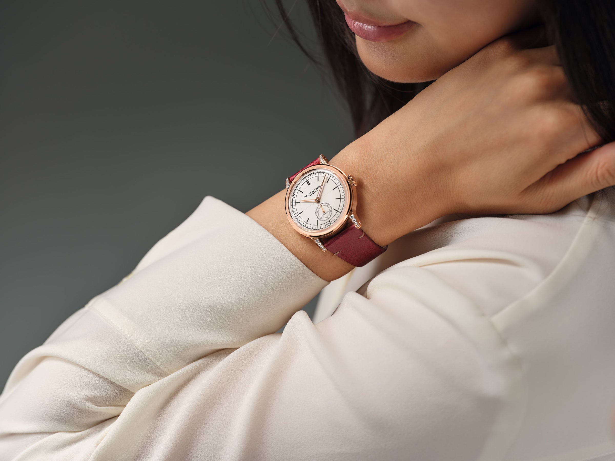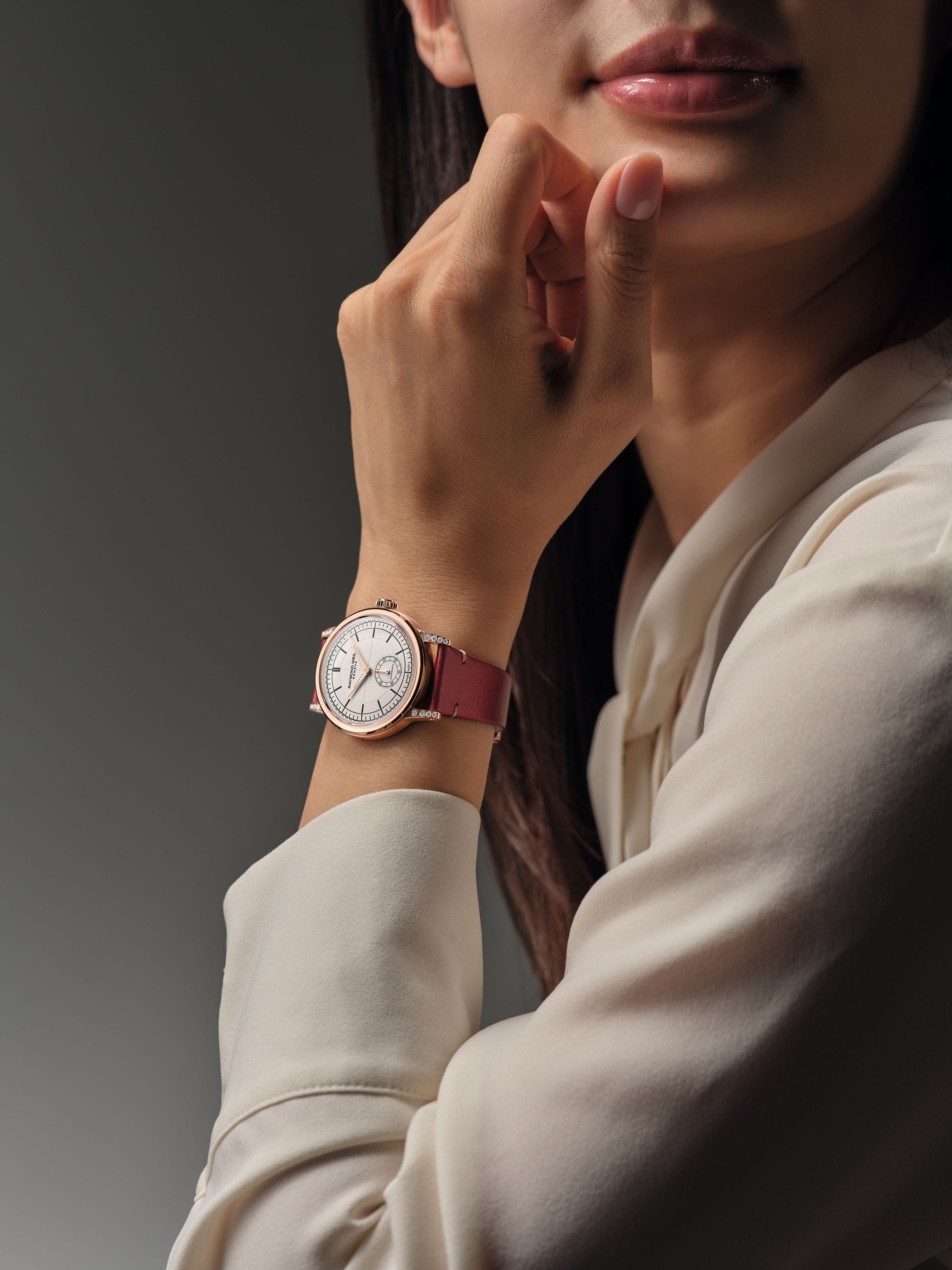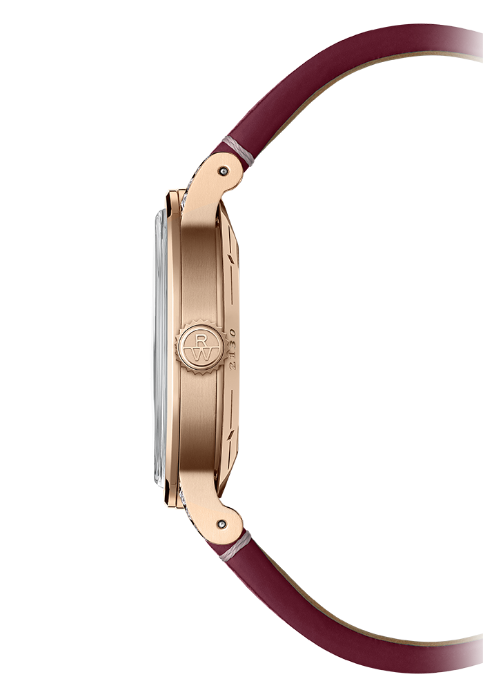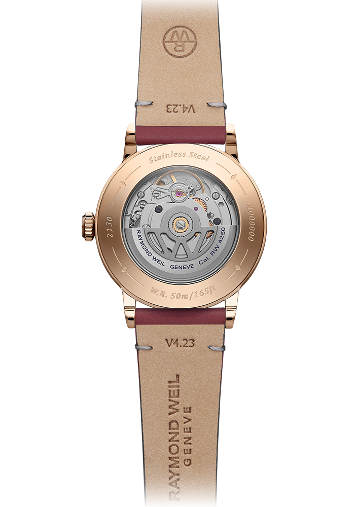 Deler av urkasse er dekorert med 16 laboratoriedyrkede diamanter (0,235 ct). Klokken leveres med rem i ekte kalveskinn i rød druefarge, med Raymond Weils signatur W-søm. Urverket er det mekaniske selvtrekkende RW4251, med 41 timers gangreserve og W-formet rotor, synlig gjennom safirglassbaklokket.