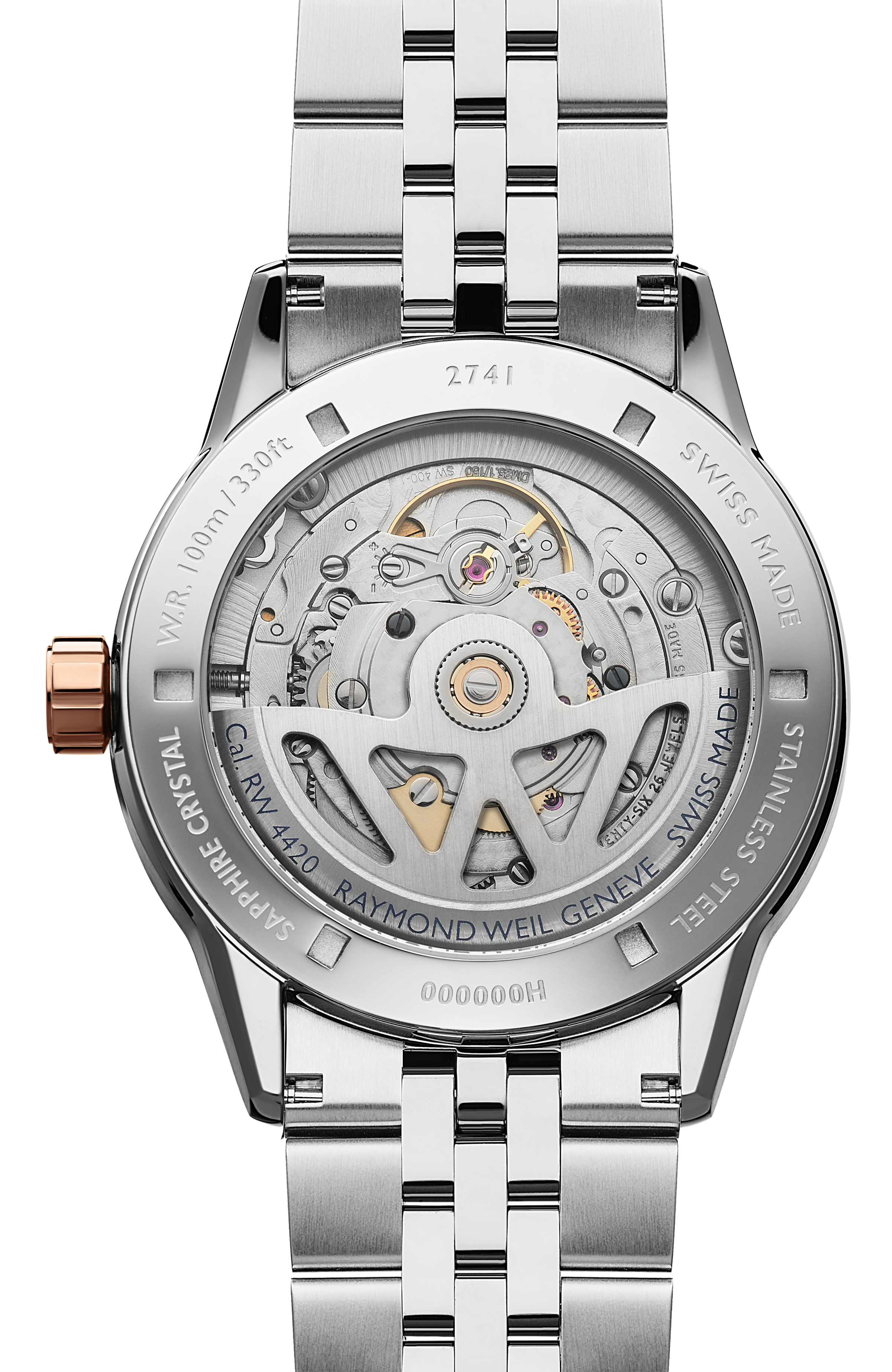 Klokken drives av et mekanisk selvopptrekkende urverk (RW4420) med 41 timers gangreserve Urverket er synlig gjennom safirglasset på bakdekselet Den tofargede stållenken med foldespenne og dobbelt trykksystem kombinerer komfort og sikkerhet, mens skrukronen med RW-monogram gir en elegant finish. Med vanntetthet opptil 100 meter kombinerer denne Freelancer-modellen ytelse og stil, og reflekterer Raymond Weils dedikasjon til både tradisjon og moderne design.