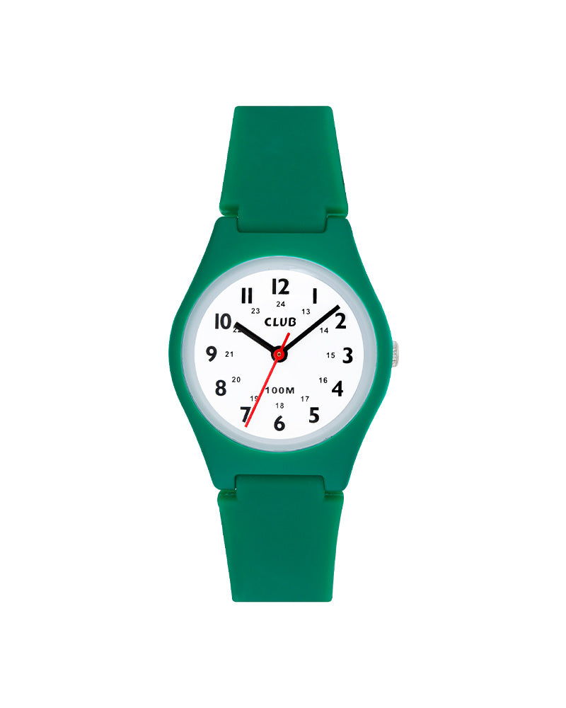 Klokken har en grønn kasse i stål kombinert med en myk grønn silikonrem som sitter godt på håndleddet og tåler aktiv bruk. Den kule ringen på innsiden av kassen gir klokken et sporty og moderne uttrykk som skiller seg ut. Med vanntetthet på 100 meter kan klokken brukes til svømming og lek i vann uten bekymring.