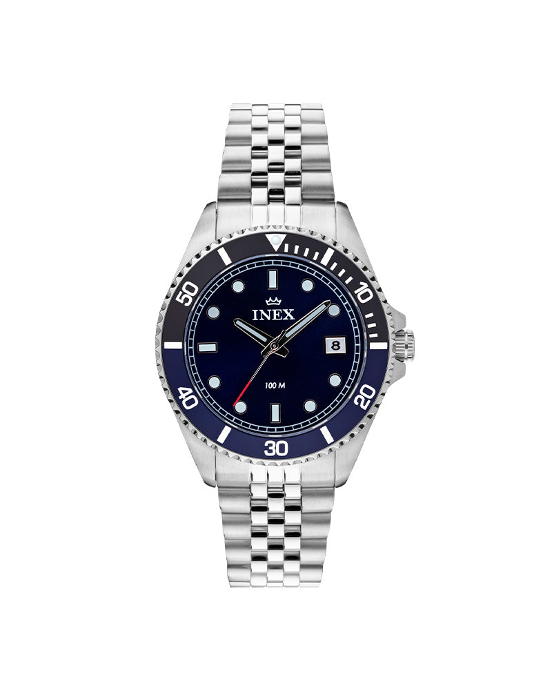 Klokken har en diameter på 40 mm, en ideell størrelse for menn som ønsker en tydelig, men balansert klokke på håndleddet. Den blå urskiven gir et eksklusivt og moderne preg, mens sølvfargede indeksmarkeringer og visere sørger for god lesbarhet. Datovisning plassert ved klokken 3 gjør klokken både praktisk og funksjonell i en travel hverdag. Den blå og sorte bezelen understreker det sporty uttrykket og gir klokken et tøft preg. Med safirglass, solid urkasse og en vanntetthet på 10 ATM er denne Inex klokken bygget for å vare.